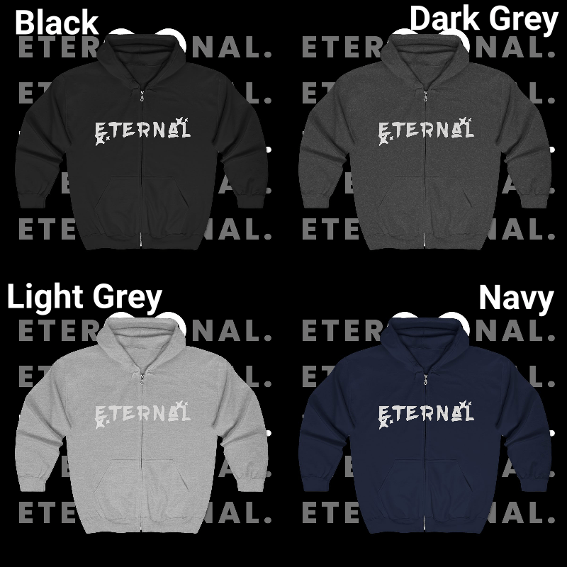 This zip-up hoodie carries a low-key, nocturnal energy. The bold ETERNAL lettering across the chest reads like a graffiti tag slightly rough, unapologetic, and sure to turn heads on late-night walks or coffee runs. Soft yet sturdy midweight fabric keeps the chill out without feeling bulky. Pockets hold your phone and small essentials; the adjustable hood tucks close when the wind picks up. Subtle wrist prints and the option for left-chest embroidery let you keep the look personal. Wear it over a band tee or layered under a coat it settles into your rotation and becomes the one you reach for when you want to feel grounded and a little defiant. Product features - 50/50 cotton-poly midweight warm, durable, and breathable - Full metal zipper with metal puller for a solid, long-lasting close - Spacious front pockets for phone, wallet, and small carry items - Adjustable hood with self-colored drawstring; classic fit that runs true to size - Embroidery option on left chest; DTF wrist prints and DTG front print Care instructions - Machine wash: warm (max 40C or 105F) - Non-chlorine: bleach as needed - Tumble dry: medium - Iron, steam or dry: low heat - Do not dryclean